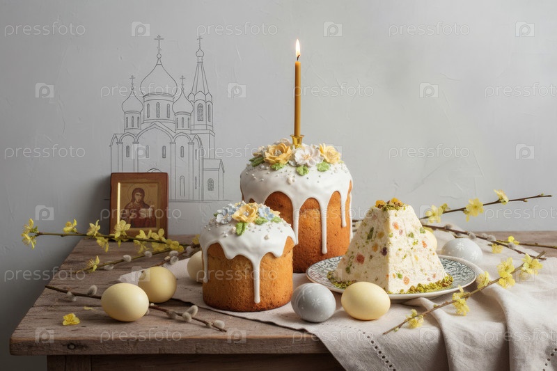 Пасхальные яйца, пасхальный торт, ива, цветы вишни и творог на серой стене с шаблоном храма.Концепция счастливой Пасхи 2026
