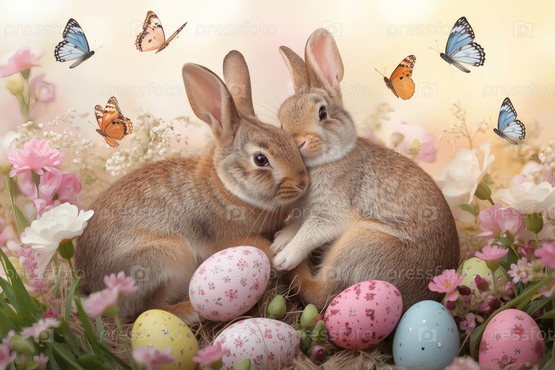 Праздничная открытка или баннер. пасхальные кролики, сидящие на траве с весенними цветами, пасхальными яйцами и бабочками. концепция счастливой Пасхи в 2026 году