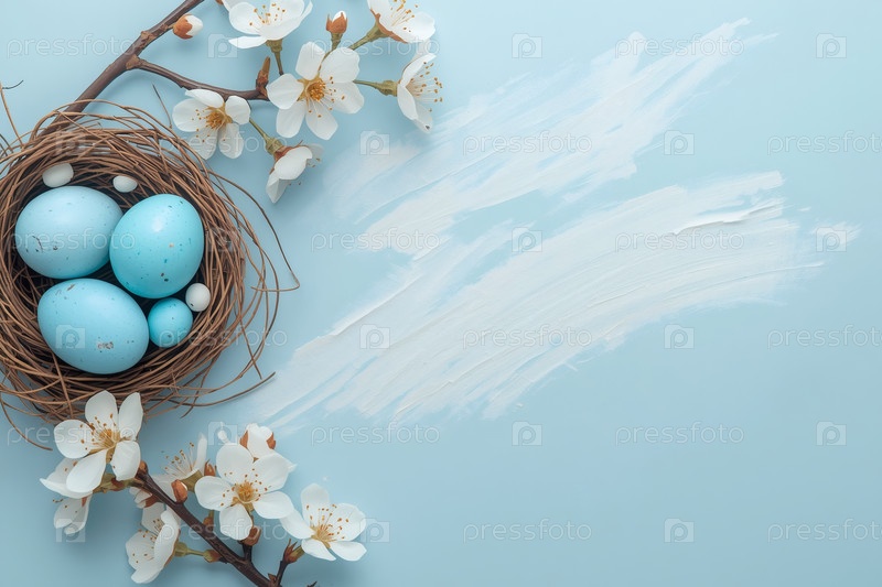Синие пасхальные яйца в гнезде ветвей и сакура на синем фоне с грубыми штрихами.Концепция счастливой Пасхи 2026