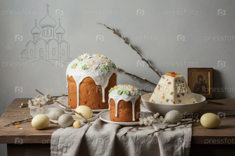 Пасхальные яйца, пасхальный торт, ива, цветы вишни и творог на серой стене с шаблоном храма.Концепция счастливой Пасхи 2026