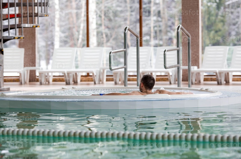 Мужчина отдыхает в круглом джакузи в бассейне с шезлонгами и зимним пейзажем на заднем плане.Концепция релаксации, спа-салона и омоложения в курортном отеле.Туризм