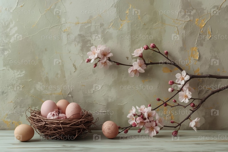 Пасхальные яйца в гнезде ветвей и сакуры на зеленом фоне с грубыми штрихами.Концепция счастливой Пасхи 2026