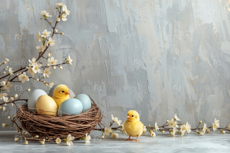 Пасхальные яйца в гнезде из ветвей, желтых птенцов и нежных цветов сакуры на серо-синем фоне с грубыми штрихами
