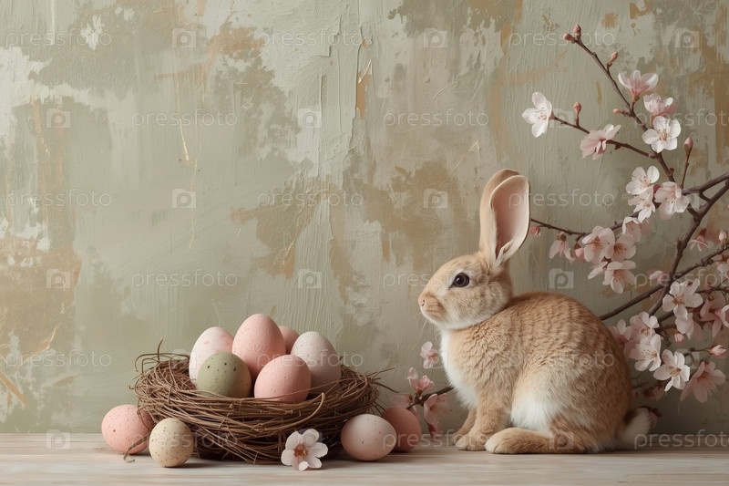 Пасхальные яйца в гнезде ветвей, бежевый кролик и нежные цветы сакуры на зеленом фоне с грубыми штрихами
