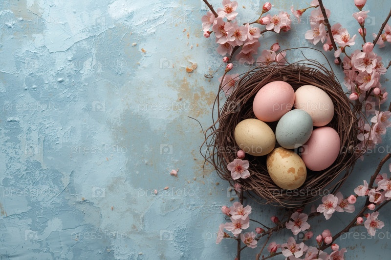 Пасхальные яйца в гнезде ветвей и нежная сакура на синем фоне с грубыми текстурированными штрихами
