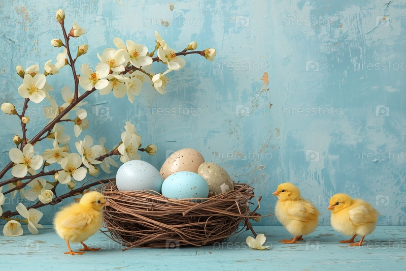 Пасхальные яйца в гнезде из ветвей, желтых птенцов и нежных цветов сакуры на серо-синем фоне с грубыми штрихами