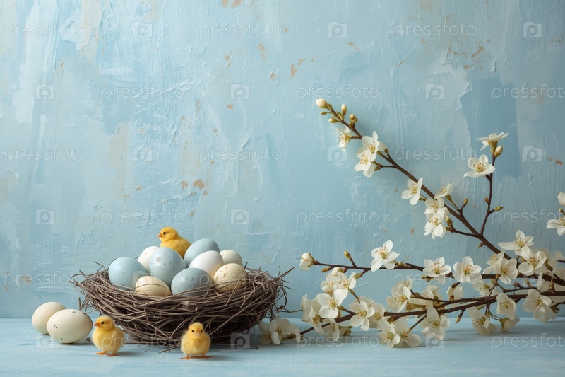 Пасхальные яйца в гнезде из ветвей, желтых птенцов и нежных цветов сакуры на серо-синем фоне с грубыми штрихами