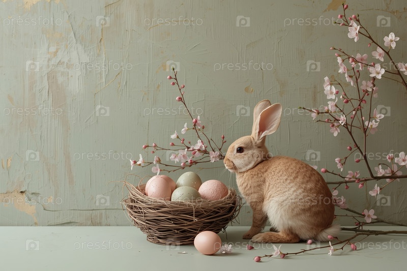 Пасхальные яйца в гнезде ветвей, бежевый кролик и нежные цветы сакуры на зеленом фоне с грубыми штрихами