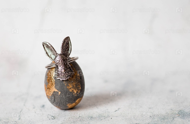 Пасхальные яйца в серых и золотых тонах и пасхальный кролик.Концепция яркого праздника Пасхи 2026 года