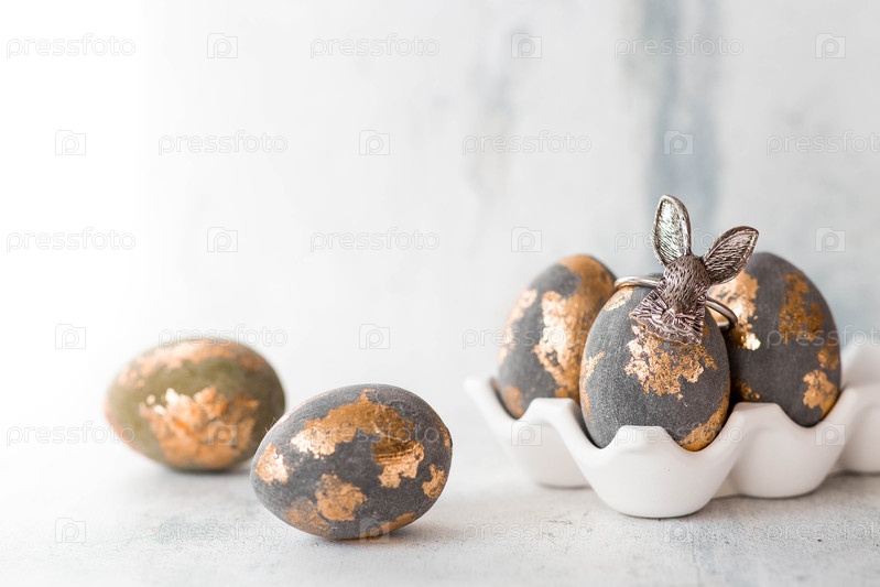 Пасхальные яйца в серых и золотых тонах и пасхальный кролик.Концепция яркого праздника Пасхи 2026 года