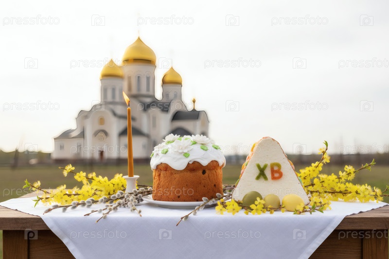 Пасхальные яйца, пасхальный торт, ива, цветы вишни и творог на серой стене с шаблоном храма.Концепция счастливой Пасхи 2026