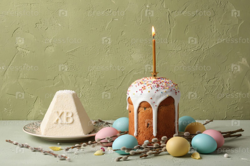 Пасхальные яйца, пасхальный торт, верба, кофейный сыр и сакура на оливковом фоне с грубыми штрихами.Концепция счастливой Пасхи 2026