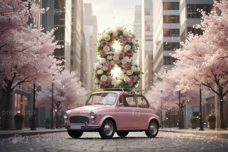 Концепция праздника Международного женского дня 8 марта.Розовый ретро-автомобиль с цветной аранжировкой в форме восьмерки на крыше, движущийся по улице города среди небоскребов