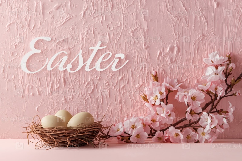 Стильные розовые пасхальные яйца в гнезде ветвей и сакура на розовом фоне с грубыми штрихами.Концепция счастливой Пасхи 2026