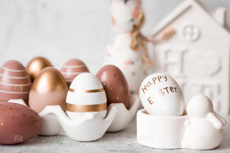 Пасхальные яйца с геометрическими узорами в бежевых и золотых тонах и пасхальный кролик.Концепция яркого праздника Пасхи 2026 года