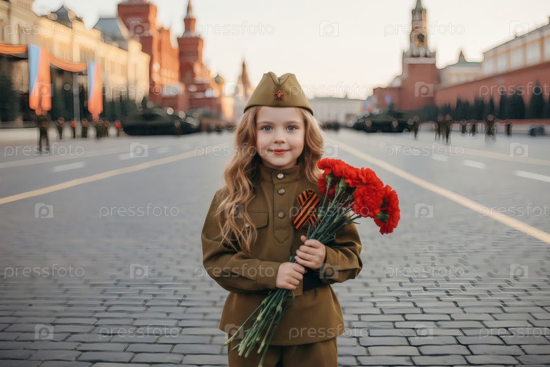Концепция праздника 9 мая.Портрет девушки в военной форме с ленточкой Святого Георгия и красными гвоздиками на Красной площади.Празднование Дня Победы 1941-1945