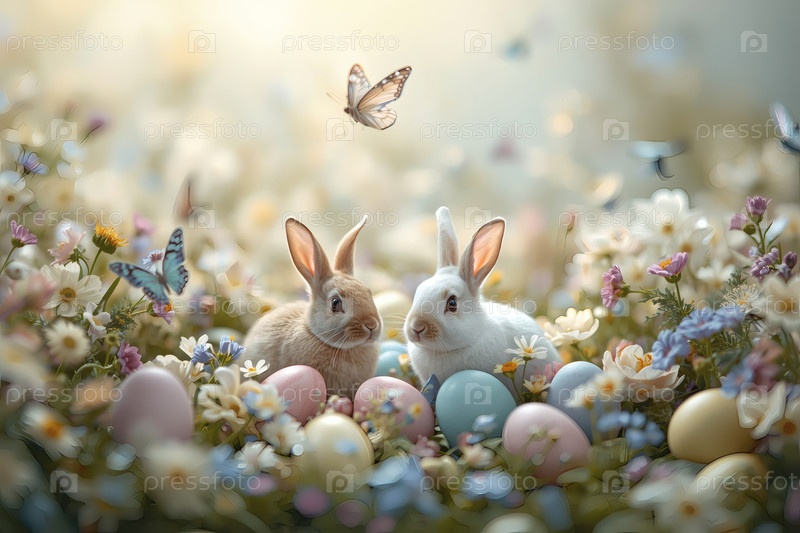 Праздничная открытка или баннер. пасхальные кролики, сидящие на траве с весенними цветами, пасхальными яйцами и бабочками. концепция счастливой Пасхи в 2026 году