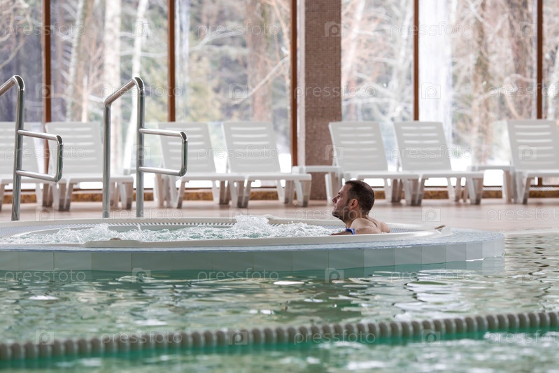 Мужчина отдыхает в круглом джакузи в бассейне с шезлонгами и зимним пейзажем на заднем плане.Концепция релаксации, спа-салона и омоложения в курортном отеле.Туризм