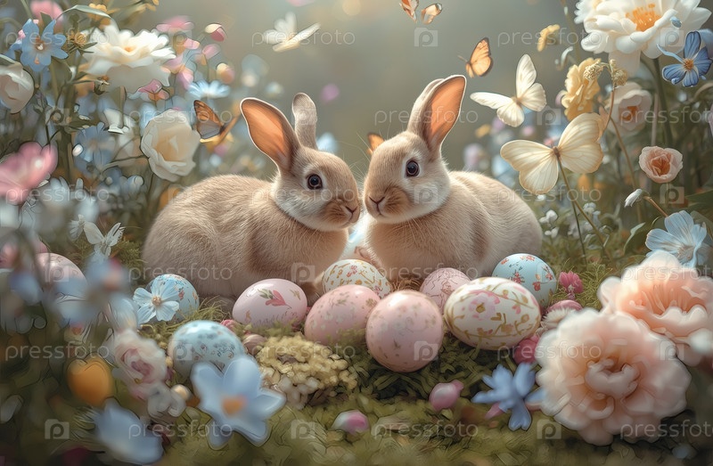 Праздничная открытка или баннер. пасхальные кролики, сидящие на траве с весенними цветами, пасхальными яйцами и бабочками. концепция счастливой Пасхи в 2026 году