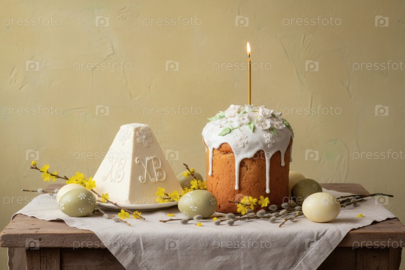 Пасхальные яйца, пасхальный торт, ива, цветы вишни и творог на зеленой стене.Концепция счастливой Пасхи 2026