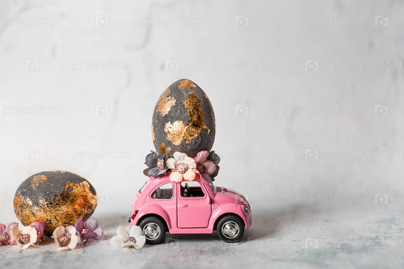 Минимализм.Розовый ретро-автомобиль с пасхальным яйцом на крыше.Концепция ярких праздников Пасхи 2026