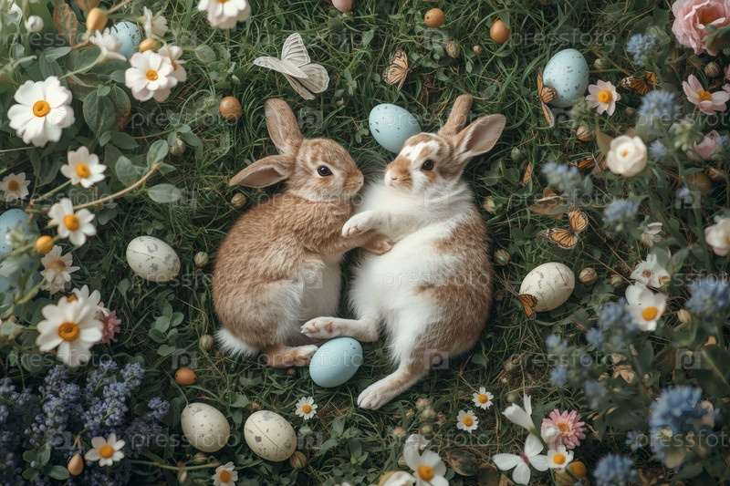 Праздничная открытка или баннер. пасхальные кролики, сидящие на траве с весенними цветами, пасхальными яйцами и бабочками. концепция счастливой Пасхи в 2026 году