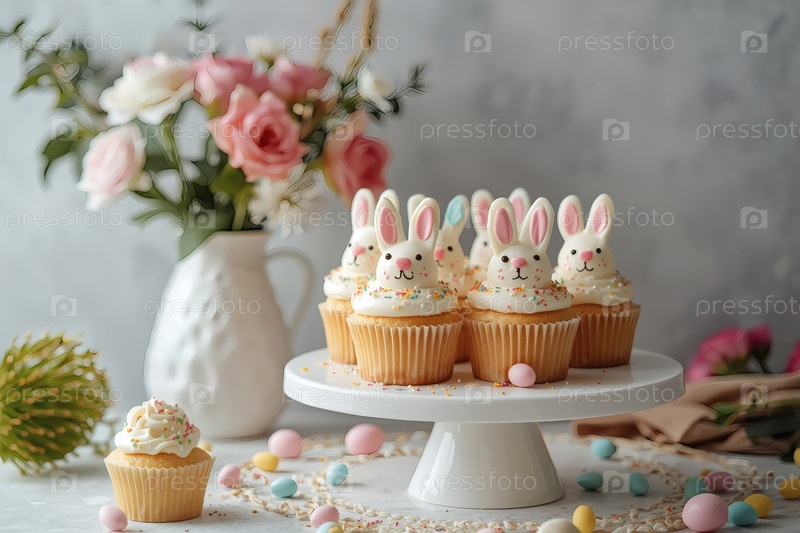 Стильные пасхальные кексы со стеклянным кроликом на белом тортовом стенде на столешнице кухни