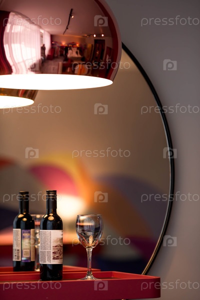 Роскошный, стильный натюрморт.Стеклянные бокалы и бутылка красного вина на бургундском столе.Концепция романтического ужина или вечеринки