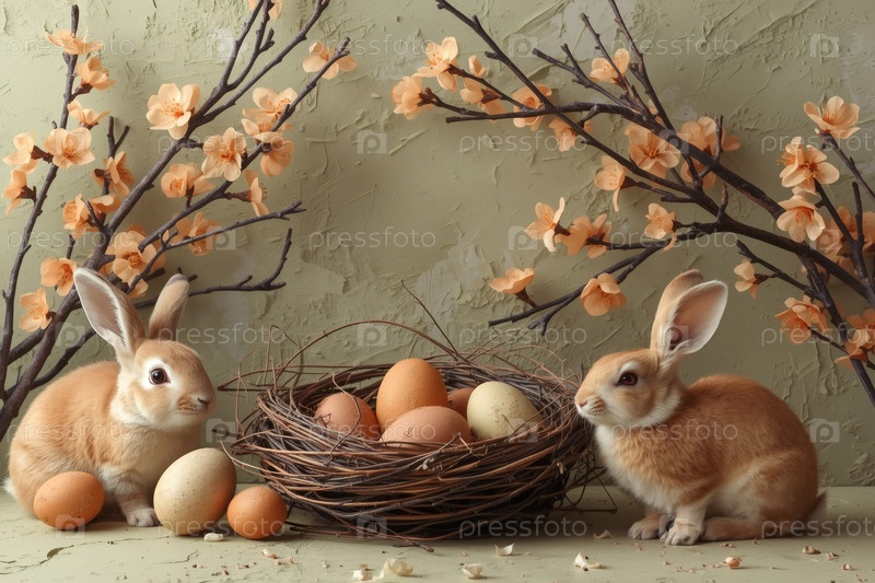 Стильные пасхальные яйца в модном цвете терракоты в гнезде из ветвей, кролика и сакуры на оливковом фоне с грубыми штрихами.Концепция счастливой Пасхи 2026