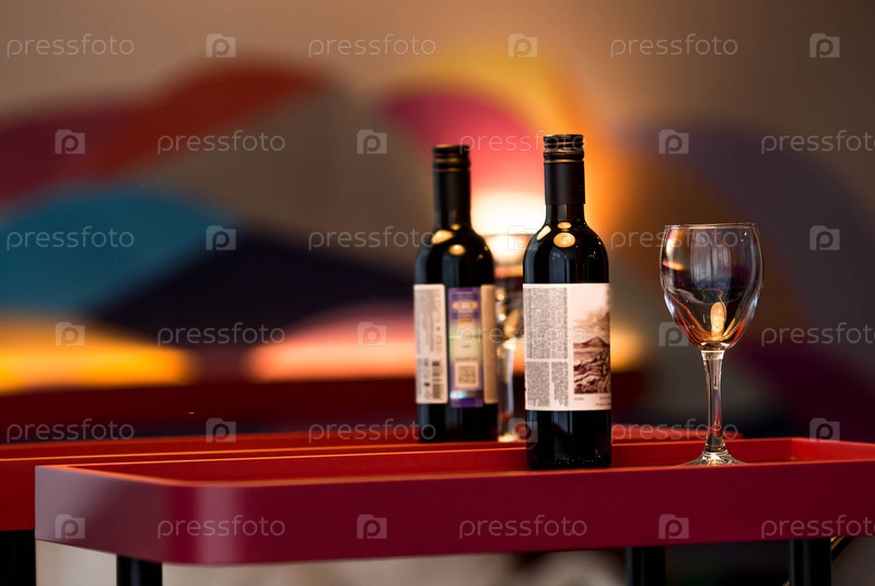 Роскошный, стильный натюрморт.Стеклянные бокалы и бутылка красного вина на бургундском столе.Концепция романтического ужина или вечеринки