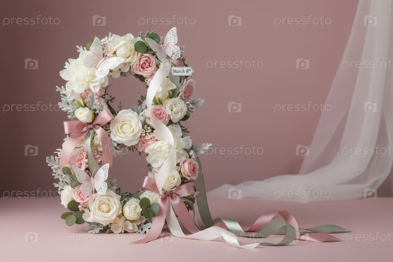 Международный женский день. баннер, флаер, красивая открытка на 8 марта. цветы в форме цифры восемь и бабочки на простом фоне