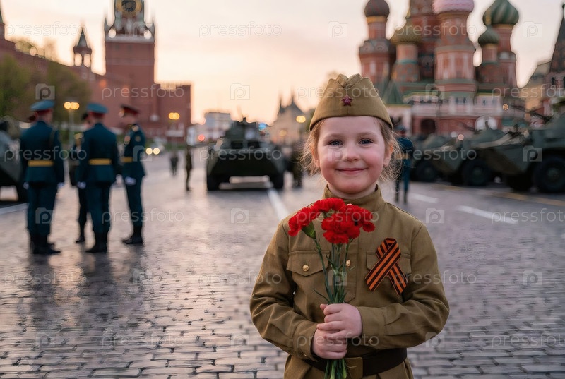 Концепция праздника 9 мая.Портрет девушки в военной форме с ленточкой Святого Георгия и красными гвоздиками на Красной площади.Празднование Дня Победы 1941-1945