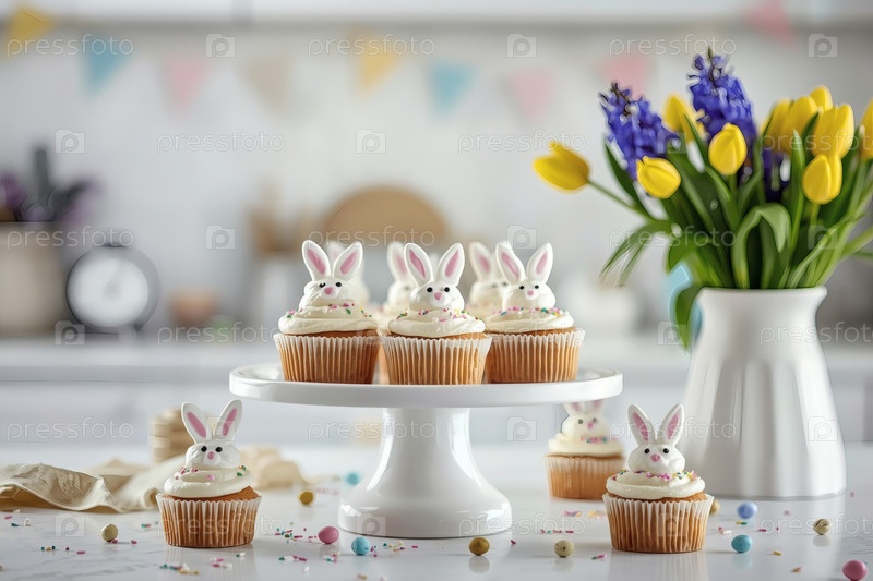 Стильные пасхальные кексы со стеклянным кроликом на белом тортовом стенде на столешнице кухни