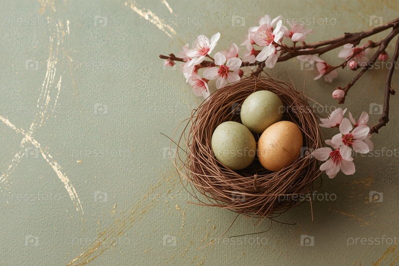 Пасхальные яйца в гнезде ветвей и сакуры на зеленом фоне с грубыми штрихами.Концепция счастливой Пасхи 2026