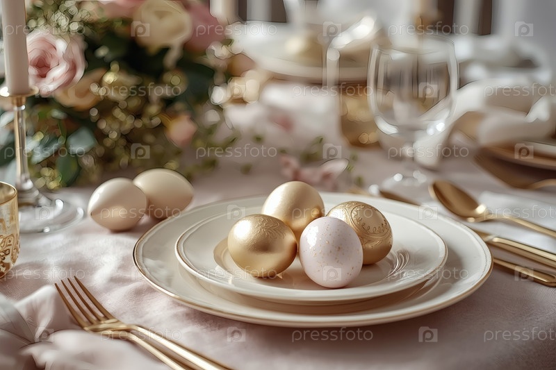 Пасхальный баннер 2026. настройка стола. декоративная тарелка, посуда, стаканы, пасхальные яйца и кролики. концепция празднования Пасхи для кафе и ресторанов