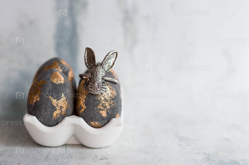 Пасхальные яйца в серых и золотых тонах и пасхальный кролик.Концепция яркого праздника Пасхи 2026 года
