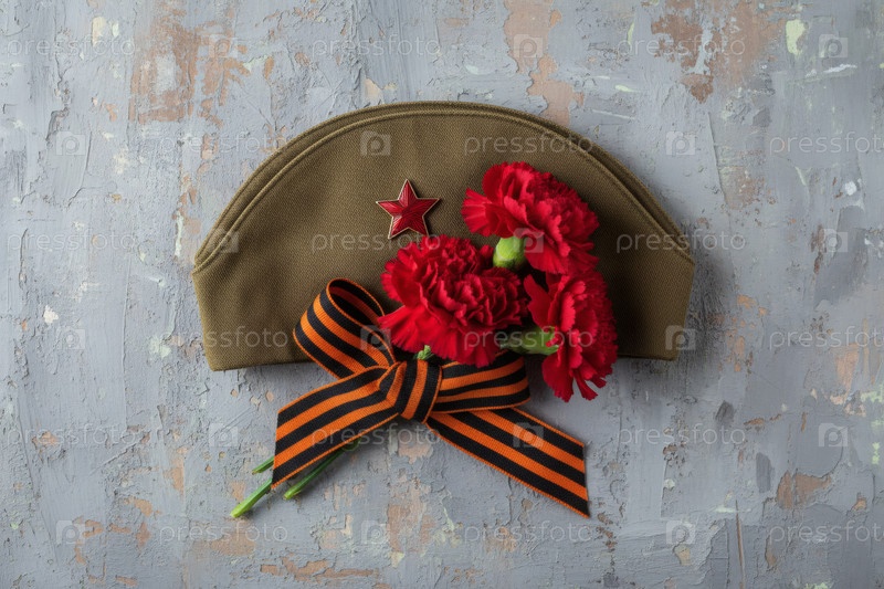 Свято-Георгиевская лента, буквы, военная шапка и красные гвозди на сером фоне.Концепция праздника 9 мая
