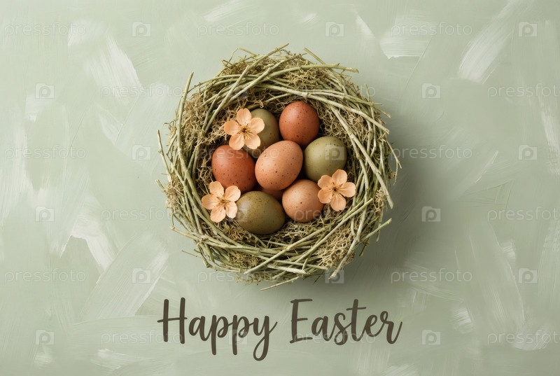 Пасхальные яйца в гнезде ветвей и нежная сакура на зеленом фоне с грубыми текстурированными штрихами