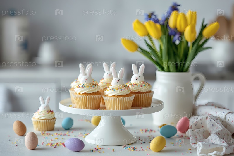 Стильные пасхальные кексы со стеклянным кроликом на белом тортовом стенде на столешнице кухни