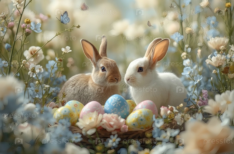 Праздничная открытка или баннер. пасхальные кролики, сидящие на траве с весенними цветами, пасхальными яйцами и бабочками. концепция счастливой Пасхи в 2026 году