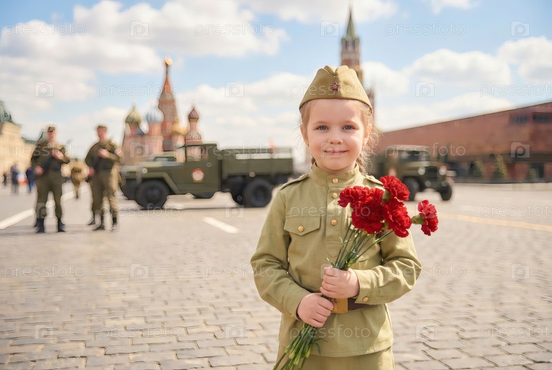 Концепция праздника 9 мая.Портрет девушки в военной форме с ленточкой Святого Георгия и красными гвоздиками на Красной площади.Празднование Дня Победы 1941-1945