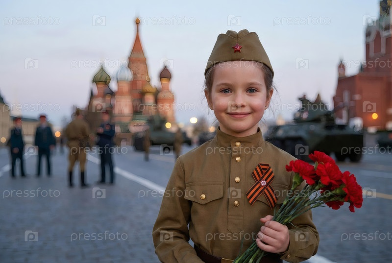 Концепция праздника 9 мая.Портрет девушки в военной форме с ленточкой Святого Георгия и красными гвоздиками на Красной площади.Празднование Дня Победы 1941-1945