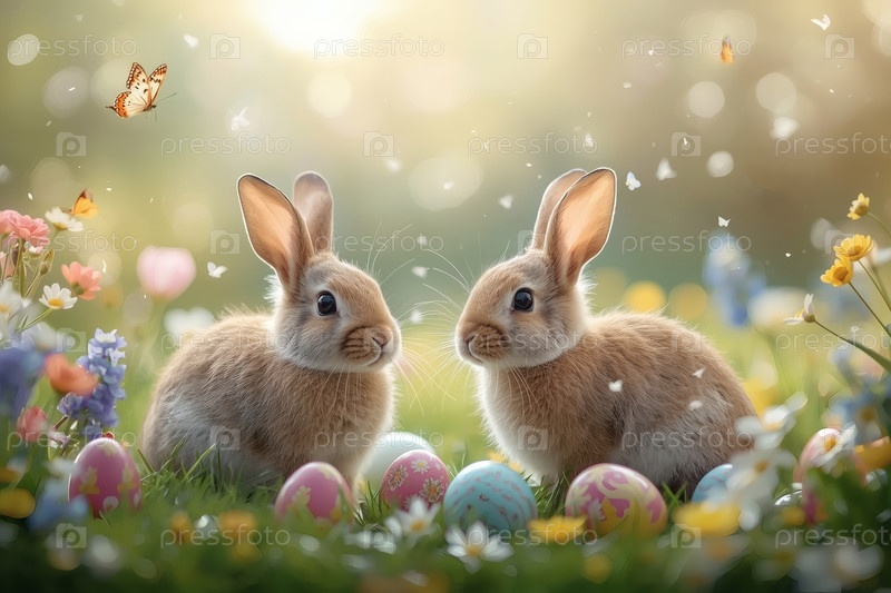 Праздничная открытка или баннер. пасхальные кролики, сидящие на траве с весенними цветами, пасхальными яйцами и бабочками. концепция счастливой Пасхи в 2026 году