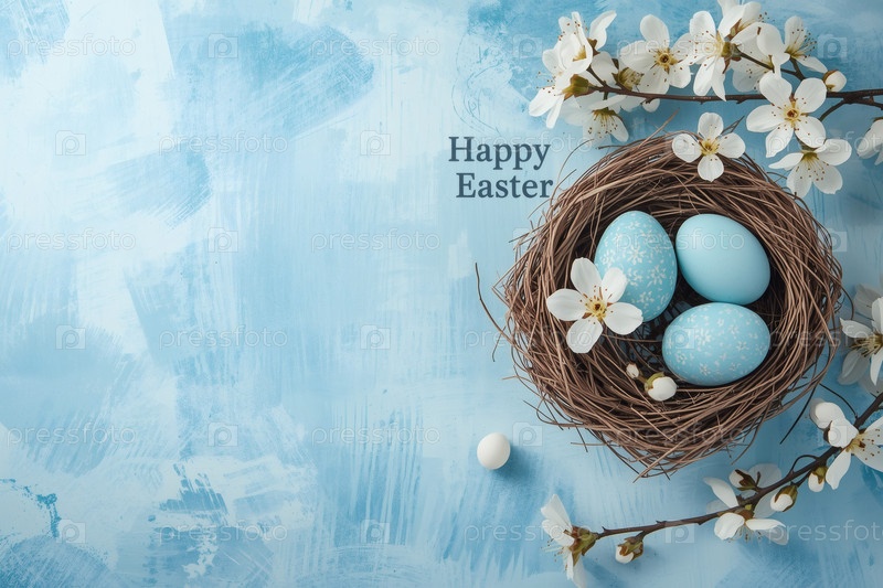 Синие пасхальные яйца в гнезде ветвей и сакура на синем фоне с грубыми штрихами.Концепция счастливой Пасхи 2026