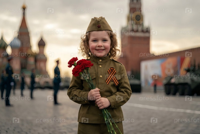 Концепция праздника 9 мая.Портрет девушки в военной форме с ленточкой Святого Георгия и красными гвоздиками на Красной площади.Празднование Дня Победы 1941-1945