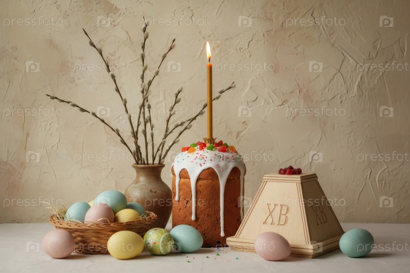 Пасхальные яйца, пасхальный торт, верба, кофейный сыр Пасха и фон сакуры с грубыми штрихами.Концепция счастливой Пасхи 2026