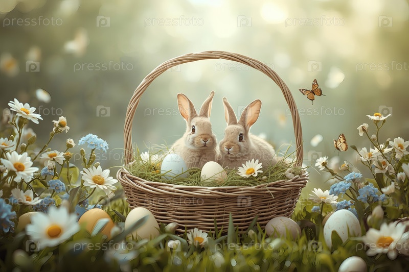 Праздничная открытка или баннер. пасхальные кролики, сидящие на траве с весенними цветами, пасхальными яйцами и бабочками. концепция счастливой Пасхи в 2026 году