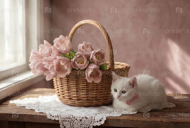 Концепция празднования Международного женского дня 8 марта. букет розовых тюльпанов в плетеновой корзине и белый котенок на столе у окна