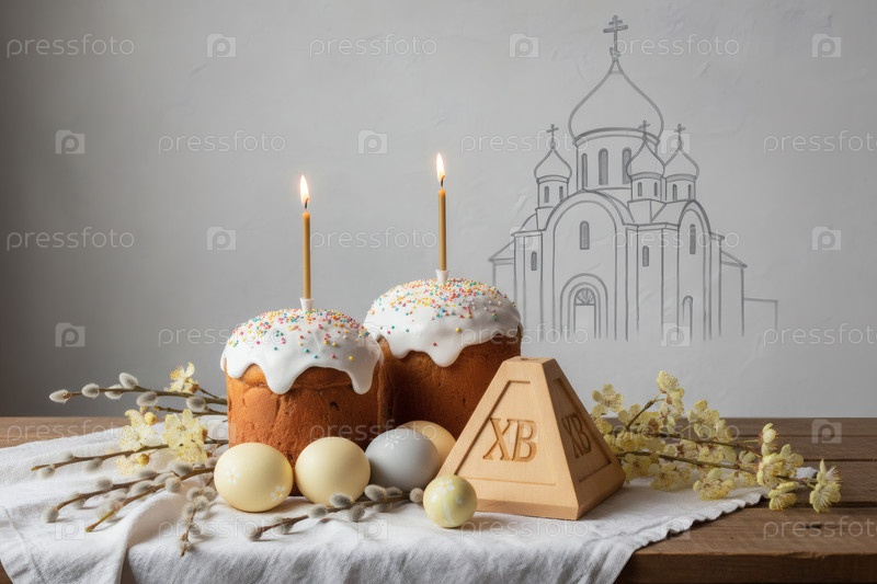 Пасхальные яйца, пасхальный торт, ива, цветы вишни и творог на серой стене с шаблоном храма.Концепция счастливой Пасхи 2026