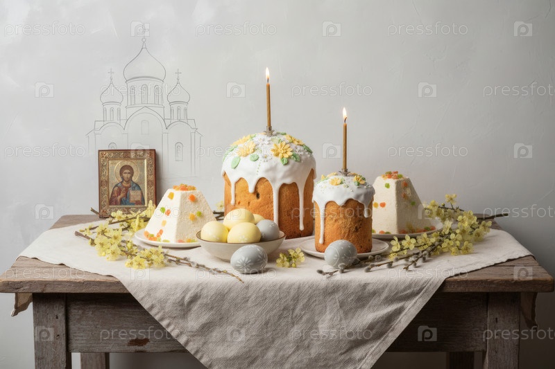 Пасхальные яйца, пасхальный торт, ива, цветы вишни и творог на серой стене с шаблоном храма.Концепция счастливой Пасхи 2026